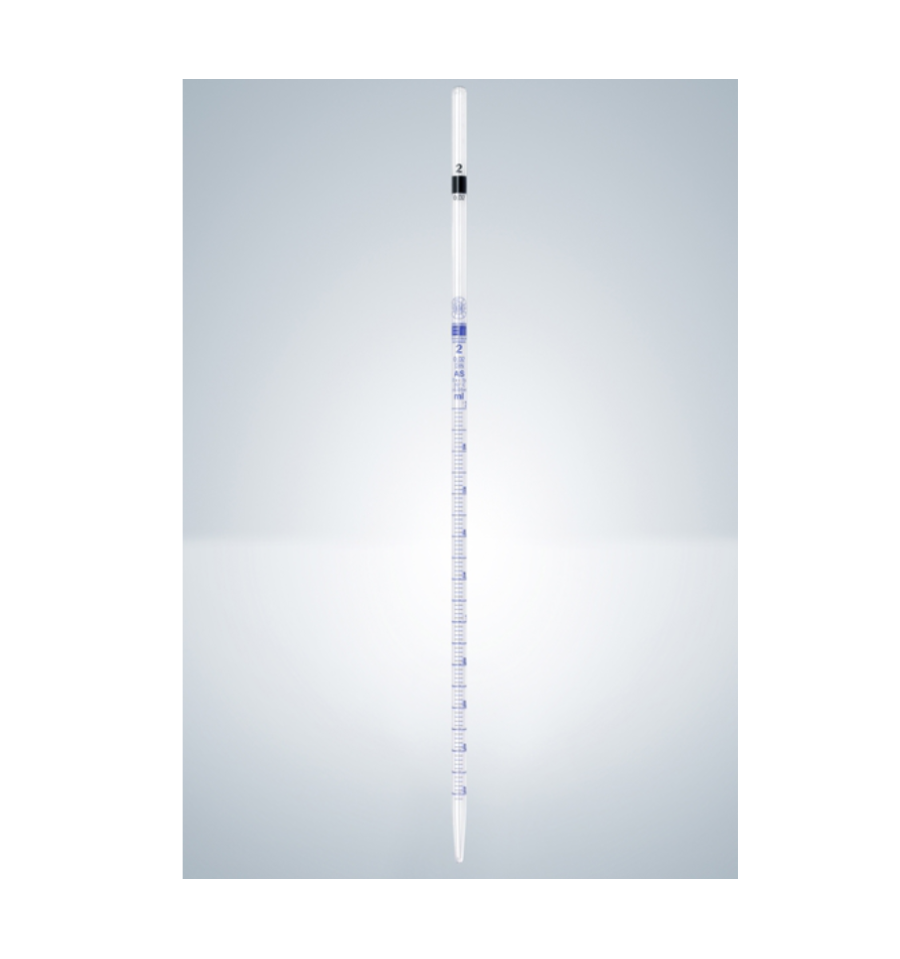Class AS, soda-lime glass, blue graduation, with declaration of conformity acc. to DIN 12600, with dated batch identification, main point ring graduation, zero point at top, graduated to tip, calibrated for EX, with standard cotton plug from 5 ml, type 3, DIN EN ISO 835. Batch Certificate of Performance and a DAkkS-Certificate (former DKD Calibration Certificate) are available on request.